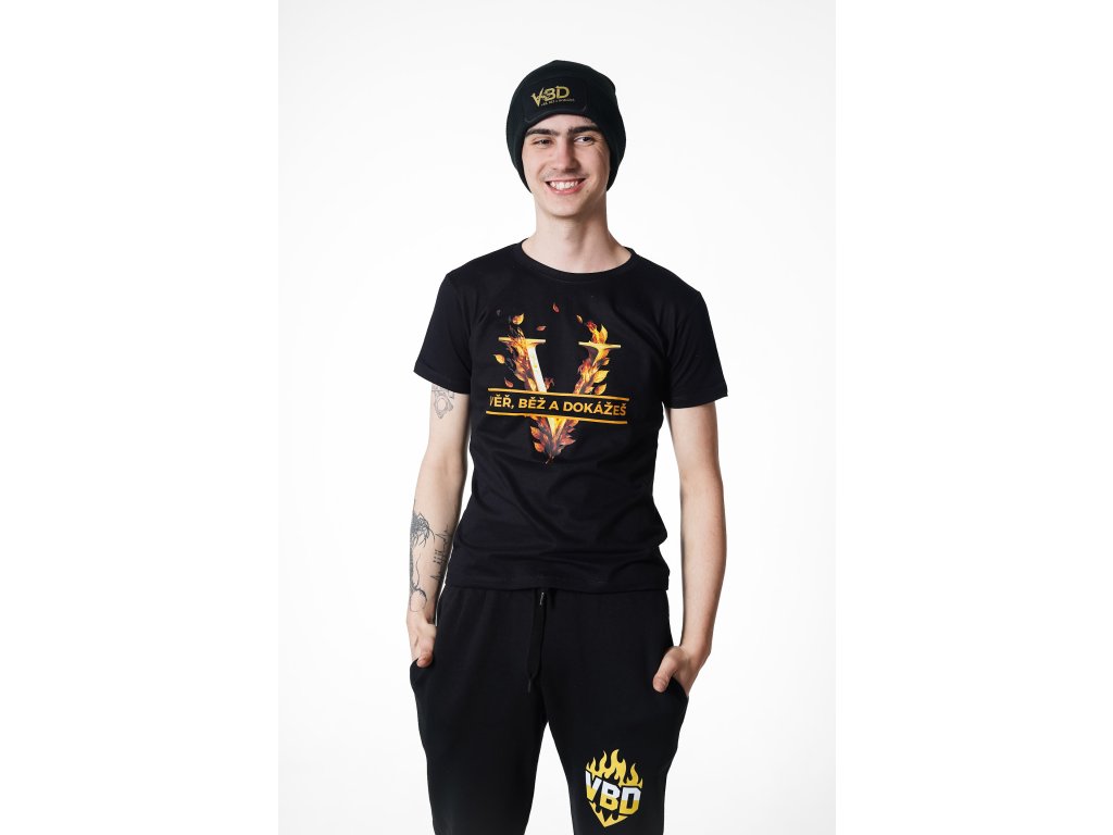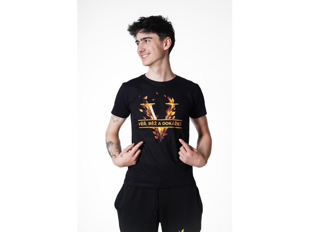 Pánské tričko s výrazným hořícím V a mottem „Věř, běž a dokážeš“. Silný design pro chlapy, kteří se nebojí jít naplno.